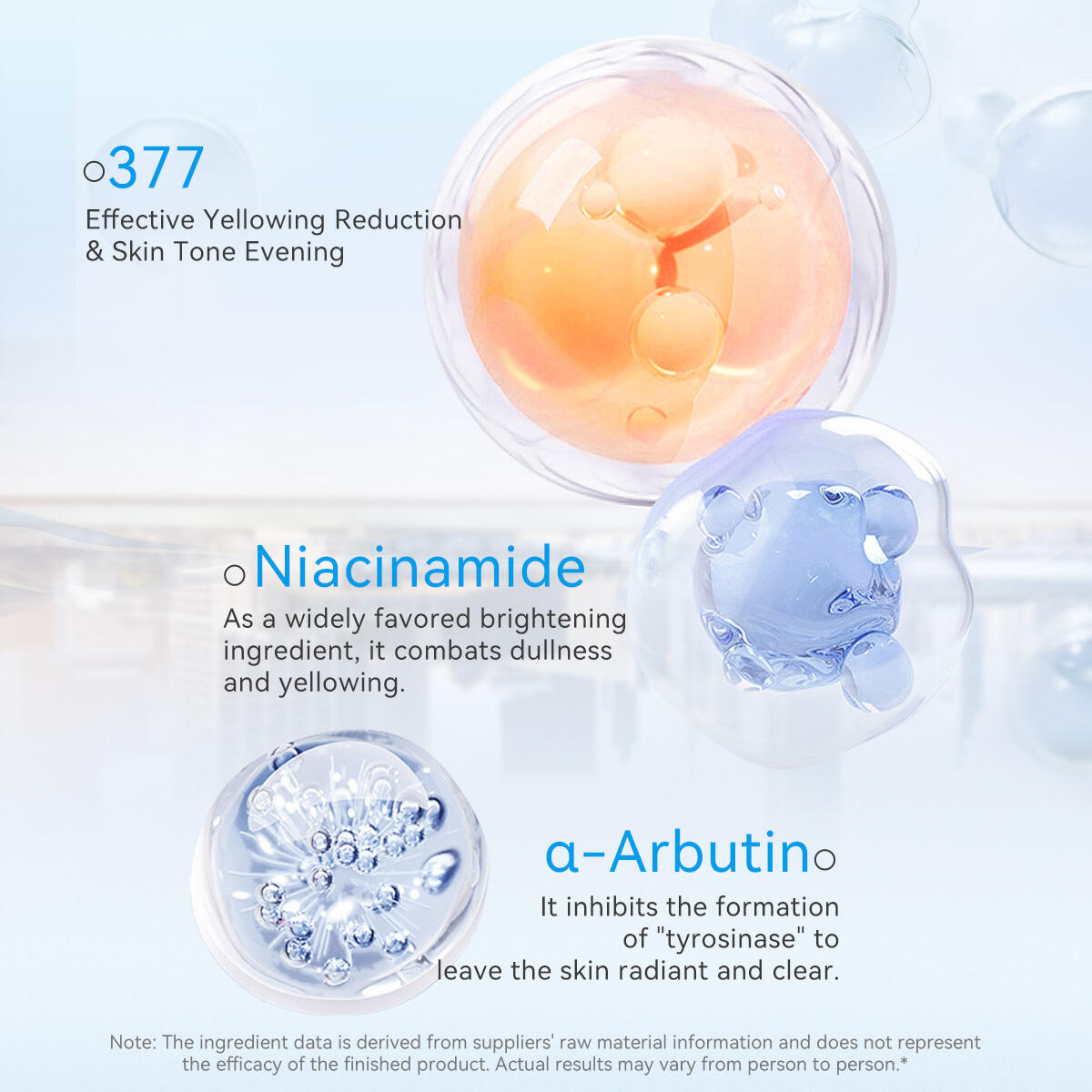 - Ingrediente principal: Niacinamida, α-Arbutina, Ectoina, Dimeticona, Caprilato/Caprato de Glicerila, Sesquioleato de Sorbitana, Extrato de Portulaca Oleracea